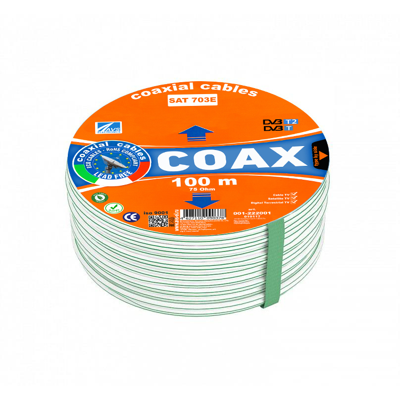 Кабель Ripo коаксиальный, SAT 703E (75 Ом), одножильный d=0,8 mm, CCS (омедненная сталь), 48*0,12 mm, CCS/AI/AI, внутренний, PVC нг(A), белый, 100м.