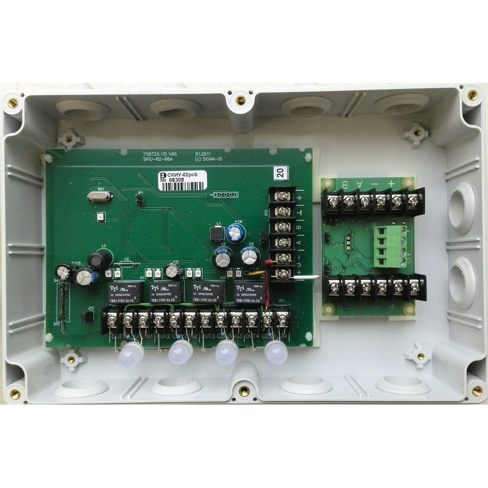 Сетевой контроллер исполнительных устройств с контролем цепей управления, 4 реле Form A, 30В, 2А, 2 ввода питания, 2 линии связи RS-485, корпус IP54